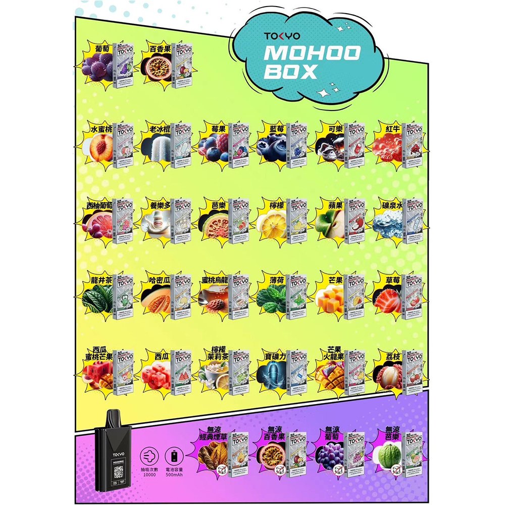 東京魔盒主機以日系簡約風格設計,精選鋁合金材質打造僅 35.25g 的輕盈機身, 配備清晰 OLED 屏幕和便捷 Type-C 快充接口,40-60 分鐘即可快速充滿 500mAh 大容量電池, 提供持久續航體驗。提供 10 種時尚配色選擇,搭載智能溫控系統和專利防漏技術,專用魔盒糖果, 超過 30 種口味選擇,每一口都細膩純正。